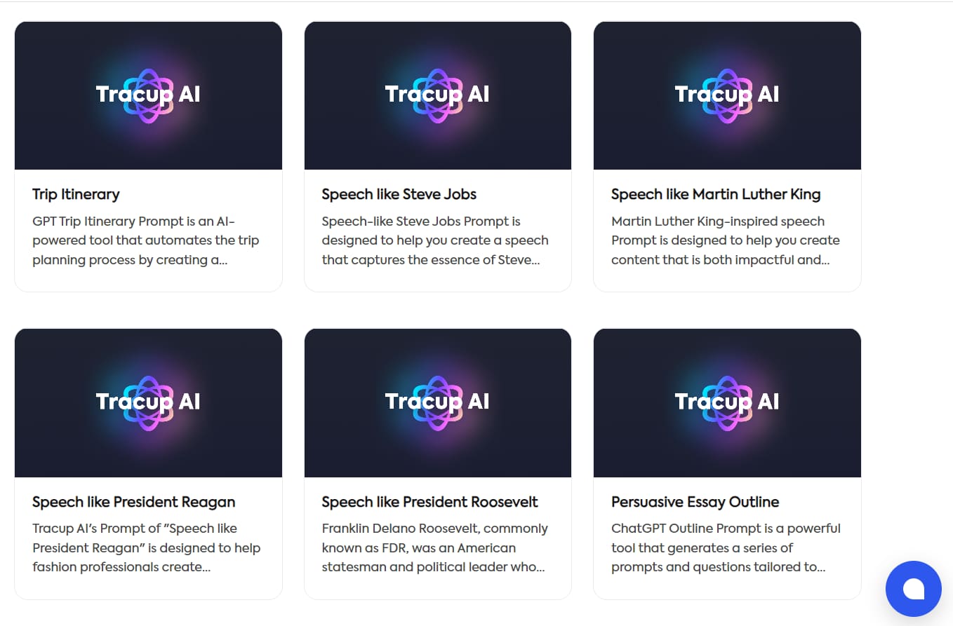 It is obvious that the more details and instructions you provide, the more satisfactory and relevant the content generated by AI will be. Tracup prompt template is designed to help users use AI more effectively by saving them the time and effort of having to think of prompts themselves. We believe that every user who has used this feature will love it.
